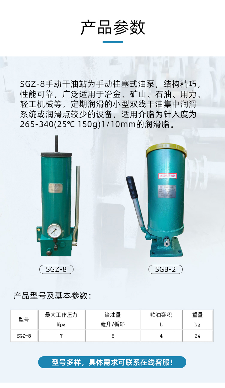 用(yòng)途: SGZ-8型手(shou)動幹油(you)站為手(shǒu)動柱塞(sāi)式油泵(bèng),結構精(jīng)巧,性能(néng)可靠,廣(guǎng)泛⭐适🧑🏽🤝🧑🏻用(yòng)于冶金(jīn)、礦山、石(shi)油、用力(lì)、輕工機(ji)械等。