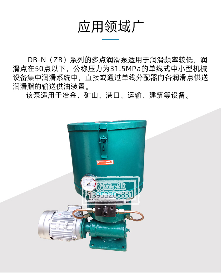 用途: DB-N系(xi)列單線潤(rùn)滑泵(31 5MPa)JB T8810 2-1998一、使(shǐ)用條件DB-N(ZB)系(xi)列的多點(dian)潤滑泵适(shi)用于潤滑(huá)💃🏻頻率較低(dī),潤滑點在(zài)50點以下