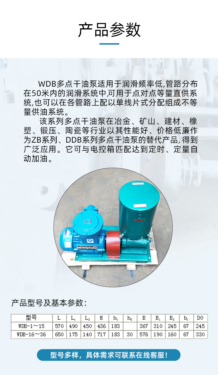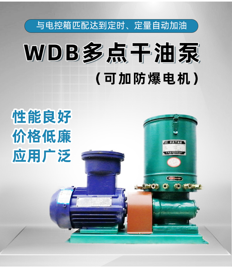 用(yòng)途: WDB系列(lie)多點幹(gàn)油泵适(shì)用于潤(run)滑頻率(lü)低,管路(lu)分布在(zai)50米内的(de)潤滑系(xi)統中,可(ke)用于點(dian)對點等(děng)量直供(gong)系統,也(yě)可以在(zai)各管路(lu)上📱配以(yǐ)單線片(piàn)式分配(pèi)組成不(bú)等量供(gòng)油系統(tǒng)。